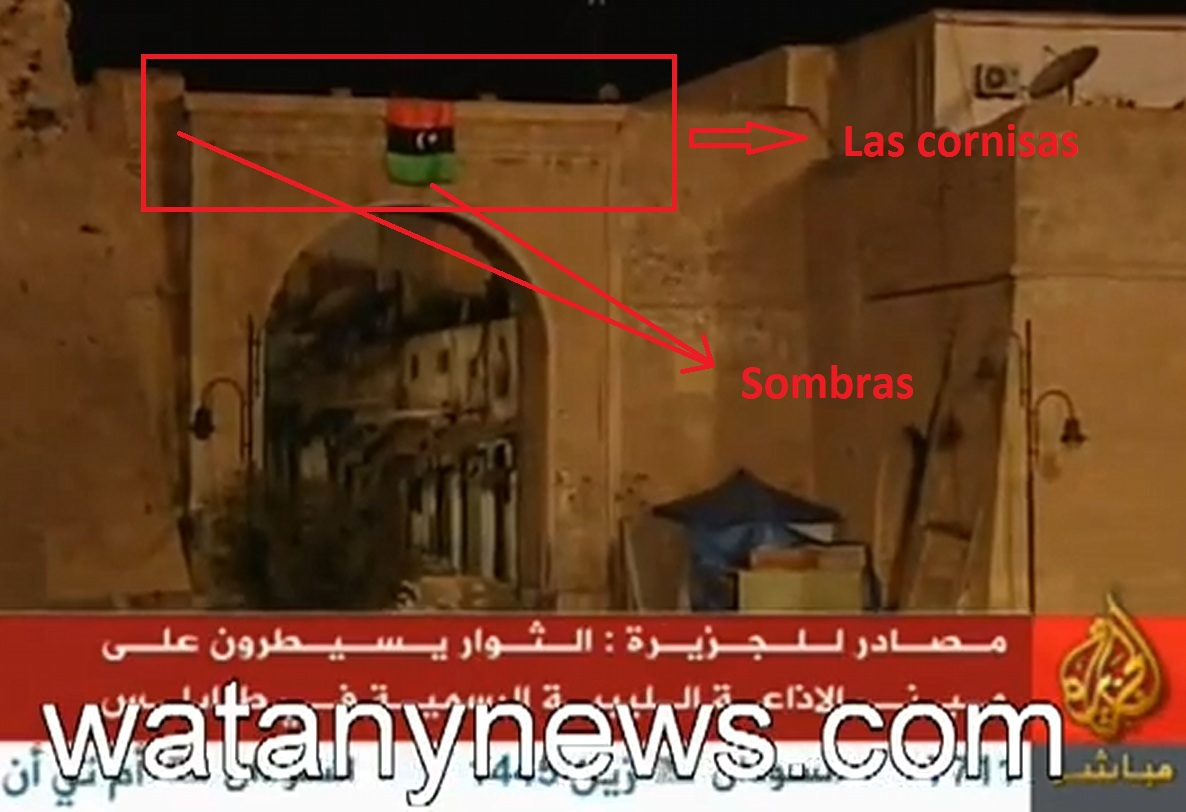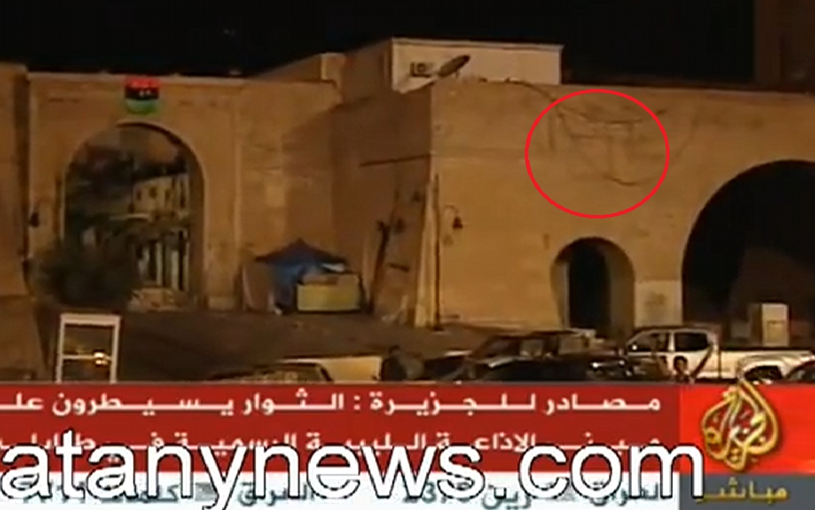 5) El montaje consistiría en la retransmisión por parte de la cadena televisiva Al Jazeera de una falsa “toma” de la Plaza Verde por parte de los antigaddafistas cuando en realidad (bueno, siempre desde el punto de vista de los conspiranoicos) no se habría efectuado toma alguna y la plaza seguiría en manos del gobierno de Gaddafi la noche del 21 al 22 de agosto (y la del 22 al 23) de 2011.