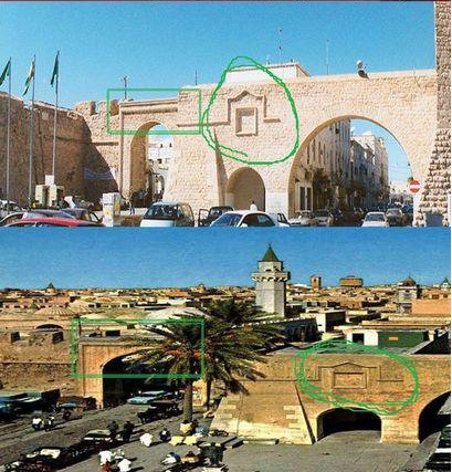 Según los “periodistas” de Russia Today, las imágenes no coinciden porque NO APARECEN unas palmeras que deberían estar al lado de los dos arcos, ni las cornisas salientes superiores de la “puerta de la medina” ni el estuco en forma de ventana que está arriba a la izquierda de los arcos principales en las imágenes de la emisora qatarí.