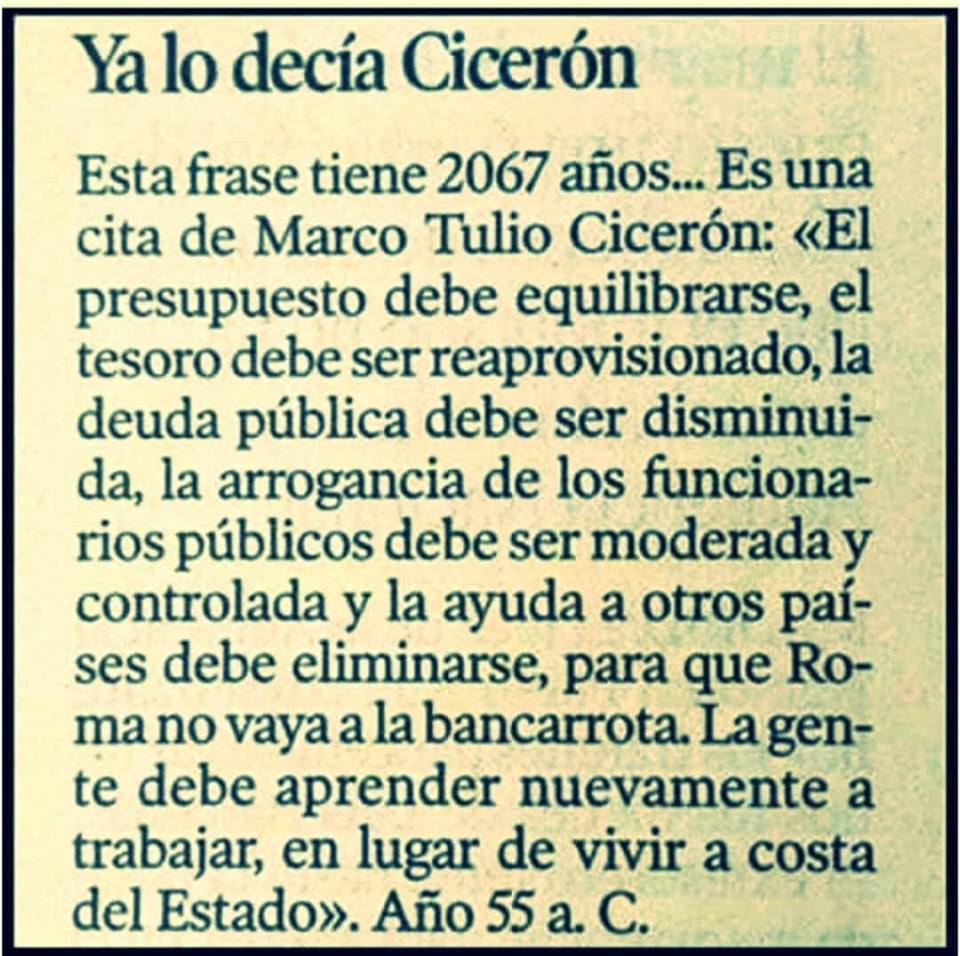 Esta frase tiene 2067 años… Es una cita de Marco Tulio Cicerón: “El presupuesto debe equilibrarse, el tesoro debe ser reaprovisionado, la deuda pública debe ser disminuida, la arrogancia de los funcionarios públicos debe ser moderada y controlada y la ayuda a otros países debe eliminarse, para que Roma no vaya a la bancarrota. La gente debe nuevamente aprender a trabajar, en lugar de vivir a costa del Estado.” Año 55 a. C.